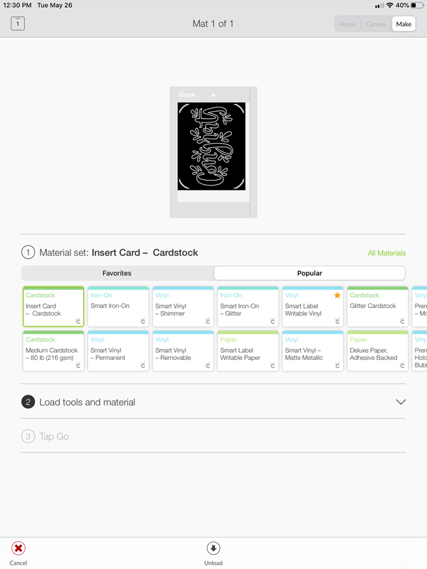 It will ask you how you will load your materials, choose, “On Card Mat” then click the “Insert Card – Cardstock” option under Material Set, load Card Mat into the machine, and then click “Go”.
