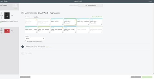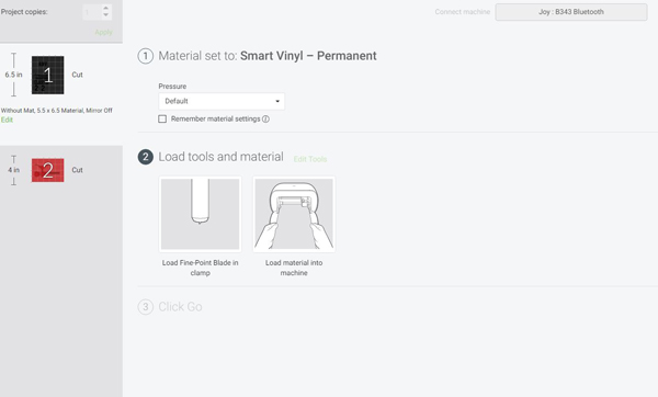 Once you have your design ready, click “Make It”, choose “Without Mat”, then “Smart Vinyl – Permanent”. You will be prompted to load your material and once you do click, “Go”. The Cricut Joy rollers will grab the vinyl and start cutting.