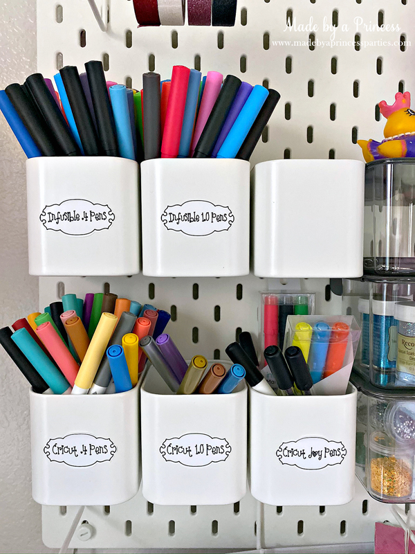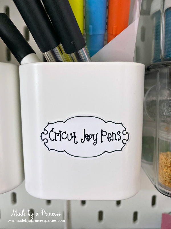 The Cricut Joy can do so many things! After I made my tiara test cut I immediately started making labels using the Smart Label Writable Vinyl. I updated my home office a bit last week with cube storage from Target and the pegboard system from IKEA. I made labels for the pegboard cups, the paper organizer, and my glitter cabinet. (Yes, I have a glitter cabinet because I’m obsessed with glitter!)