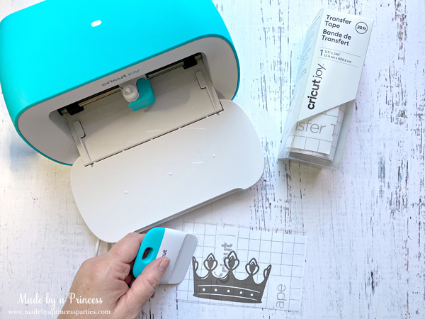 When your decals are done, weed the image and get your transfer tape ready. Cut a piece of transfer tape slightly bigger than your image, remove the backing, and place it over your decal. Use your Cricut Joy Scraper to remove bubbles and to ensure the vinyl has adhered to the tape.