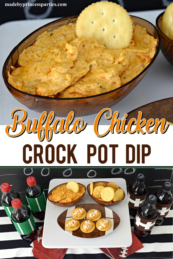 Score big with this Crock Pot Cheesy Buffalo Chicken Dip Recipe! Easy to make and oh so easy to eat. Throw all the ingredients in a crock pot, heat, and enjoy the game with a crowd pleasing yummy munchie!