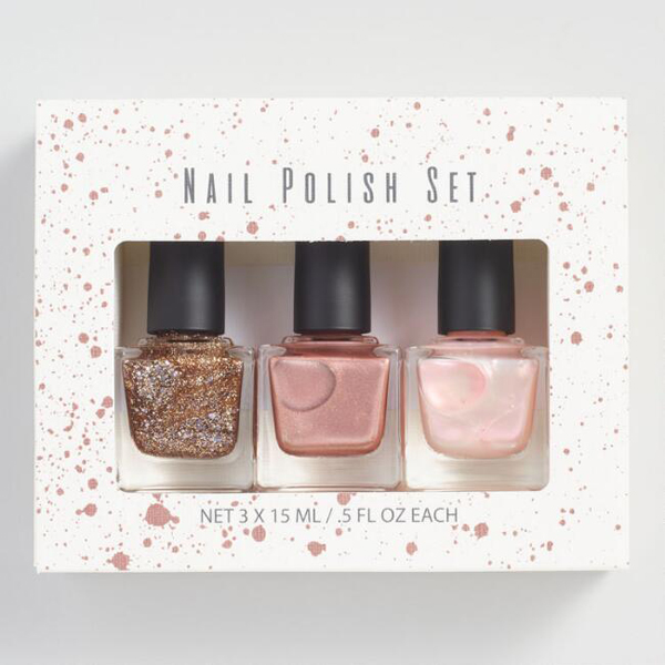 Gold Dust Mask | Color Club Trio Rose Gold Nail Polish Set | Gold Opal Earrings | Gold and Rhinestone Necklace | Word Hair Pins | Blush Velvet Kimono