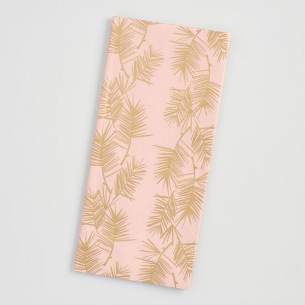Pink and Gold Pine Needle Napkins | Holiday Sentiment Napkins | Gold Foil Table Runner | Gold Chargers | Gold Rimmed Plate | Gold Wave Flatware