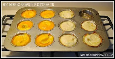 This past Tuesday Miss Cupcake had croup so I stayed home with her. Couldn’t really do much, it’s not like I could take her Christmas shopping, so I looked around my kitchen while she was napping and thought, “Hmph. What can I make that’s not going to make a big mess or take too long?” Let’s check the frig. Milk, Pomegranate Limeade, open jar of salted caramel sauce, pickles, eggs, sausage, cheese, Vitamin Water, greek yogurt…wait…go back to the eggs, sausage, and cheese…egg muffins in a tin! Yes! I saw them on Pinterest and have been wanting to make them. Got out my cupcake tin and was in business.